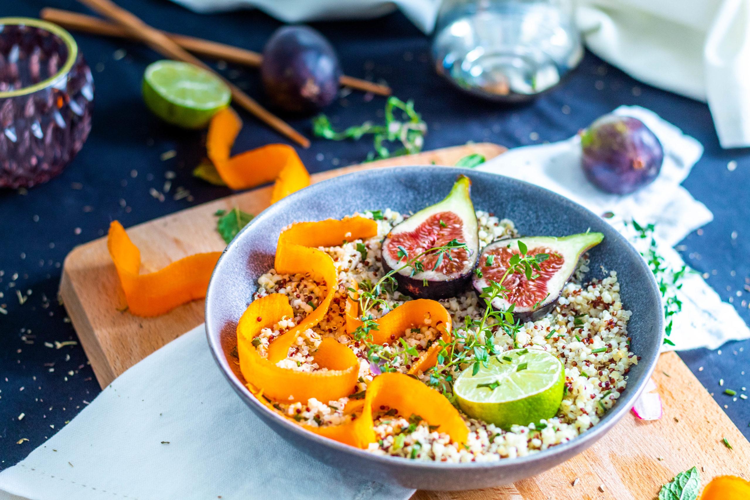 Ajoutez les figues en morceaux (vous pouvez remplacer la figue par des fruits frais de saison), des herbes et épices selon vos préférences (nous utilisons du sel, du poivre, de la coriandre), une cuillère à soupe d'huile d'olive ainsi que du jus de citron puis mélangez bien l'ensemble.